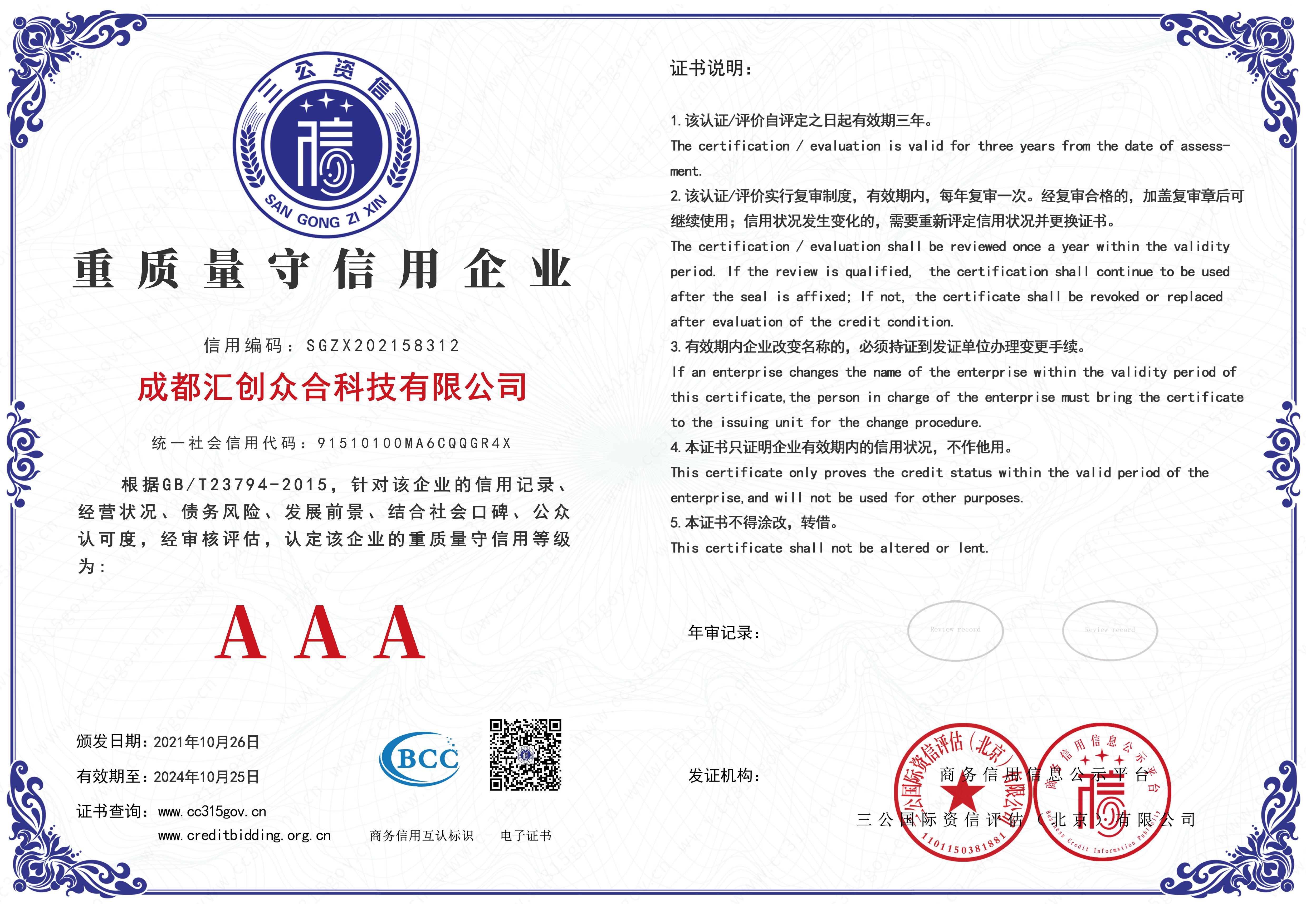 守信激励,失信惩戒。成都汇创众合科技有限公司,多年来以诚信为本、做诚信经营,在第三方权威机构的信用评级过程中,荣获评级证书(AAA重质量守信用企业):