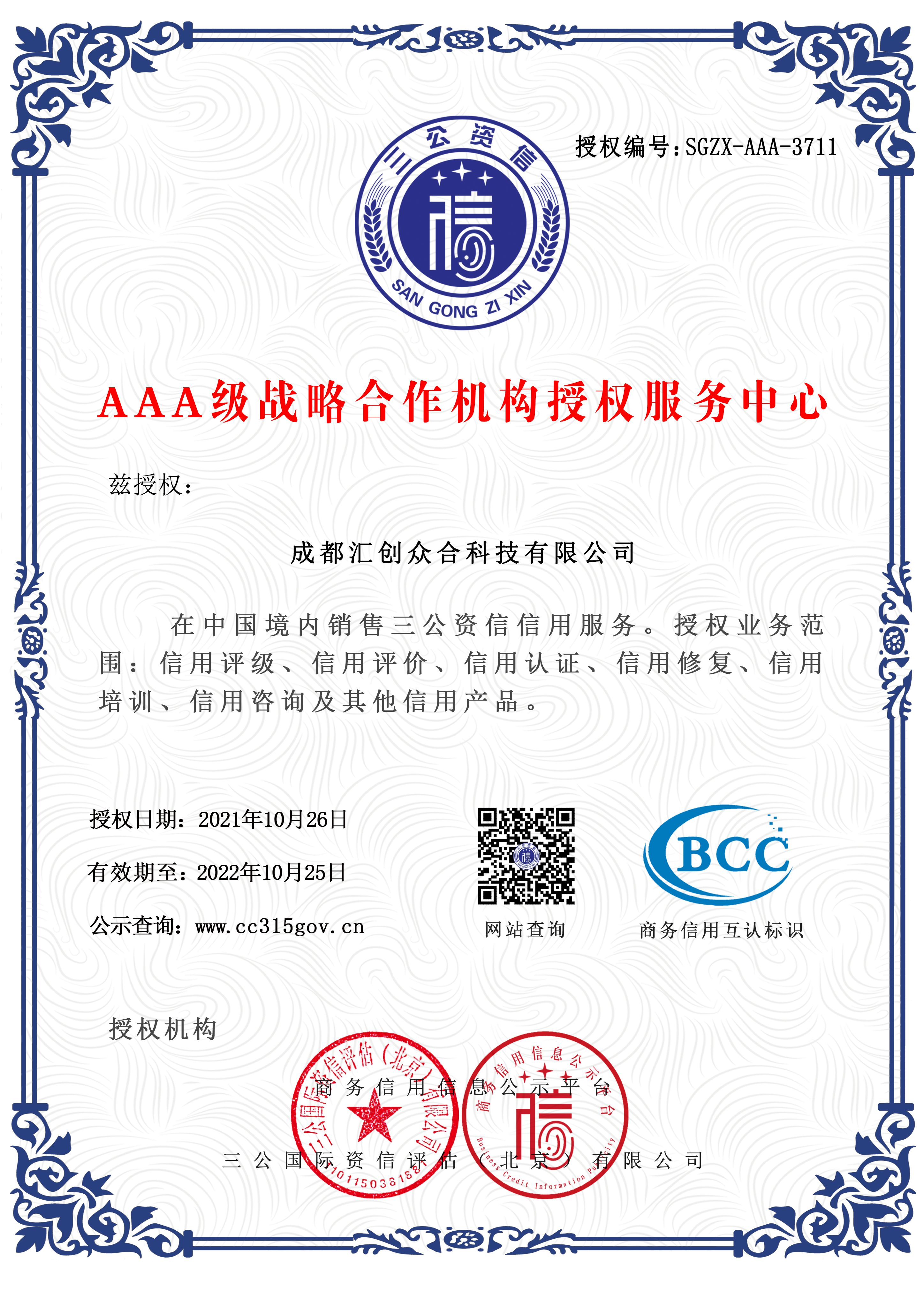 战略合作-恭喜公司获批三公资信战略合作机构企业3A认证又称“信用评级”,是信用标准化领域中一个十分重要的认证。是促进全国范围内的企业信用标准化行为,以利于企业产品与服务的信用交流,以及在知识、科学、技术和经济活动中发展企业间的信用相互合作。 信用时代已到来!为加快社会信用体系的建设,企业信用等级评价作为开展信用评价的政策措施已经在全国各地施行,企业信用等级评价不仅可以作为宣传推广、提升企业品牌形象、提高市场竞争力的有效方式,同时也切实反映了企业履行商业合约和承揽项目的能力。 按照国家政策趋势发展,也为了更好推进社会信用体系的建设,成都汇创众合科技有限公司经过三公资信公司评估、获批成为其AAA级战略合作机构,为企业开展信用评级工作贡献自身的一份力量: